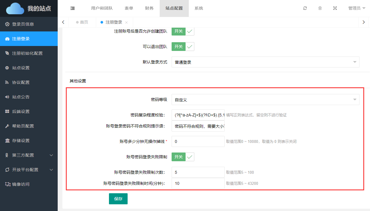 注册登录主要设置和账号注册和登录有关的内容,在此页面可进行注册功能是否开启以及其他各种与注册登录相关的设置。