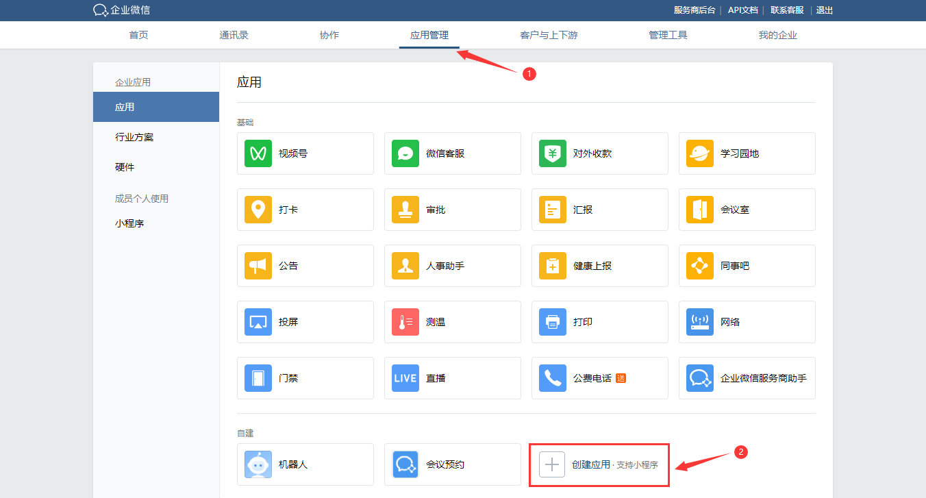 1、登录企业微信后台。 2、在应用管理页面,找到自建应用,然后单击创建应用。