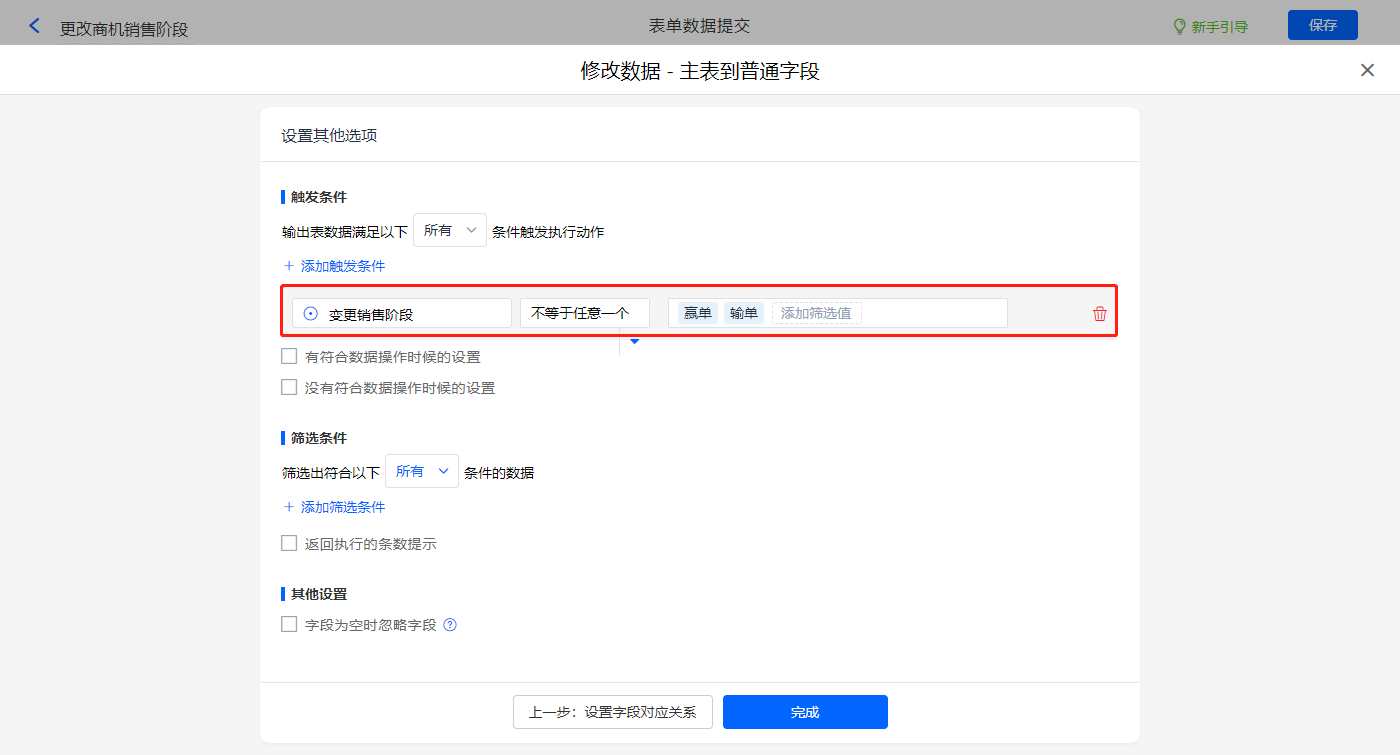 触发条件设置为当【变更销售阶段】字段不等于【赢单】,则修改主表【销售阶段】、【阶段变更时间】、【阶段类型】三个字段的值;