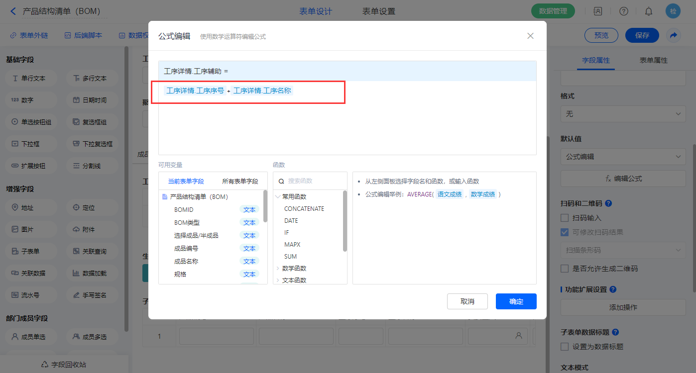 【工序详情.工序辅助】字段,设置默认值为公式编辑,如图设置公式;