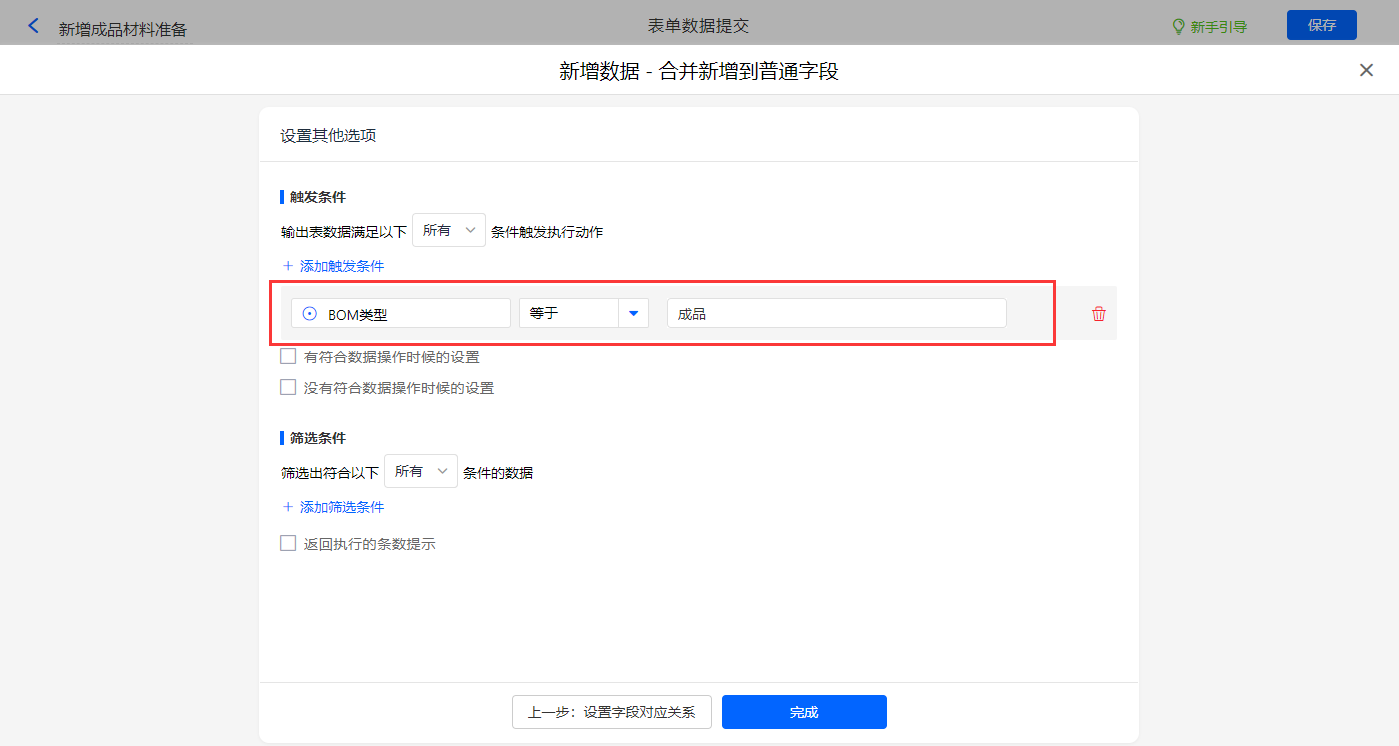 其他设置触发条件为【BOM类型】字段等于成品,设置好点击【完成】并保存该数据助手;