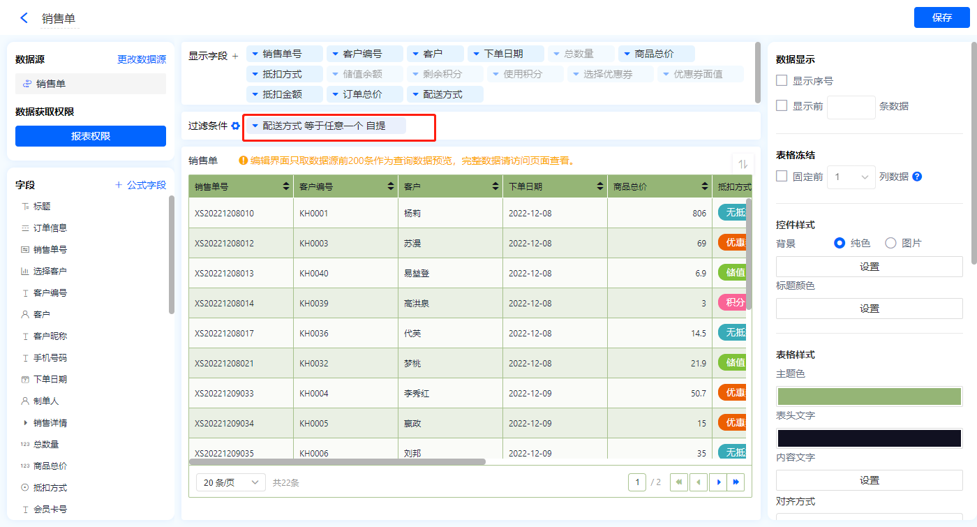1)参照2.8、【自提销售单】表单的搭建方式,变更数据表的过滤条件为【配送方式】等于商家配送;