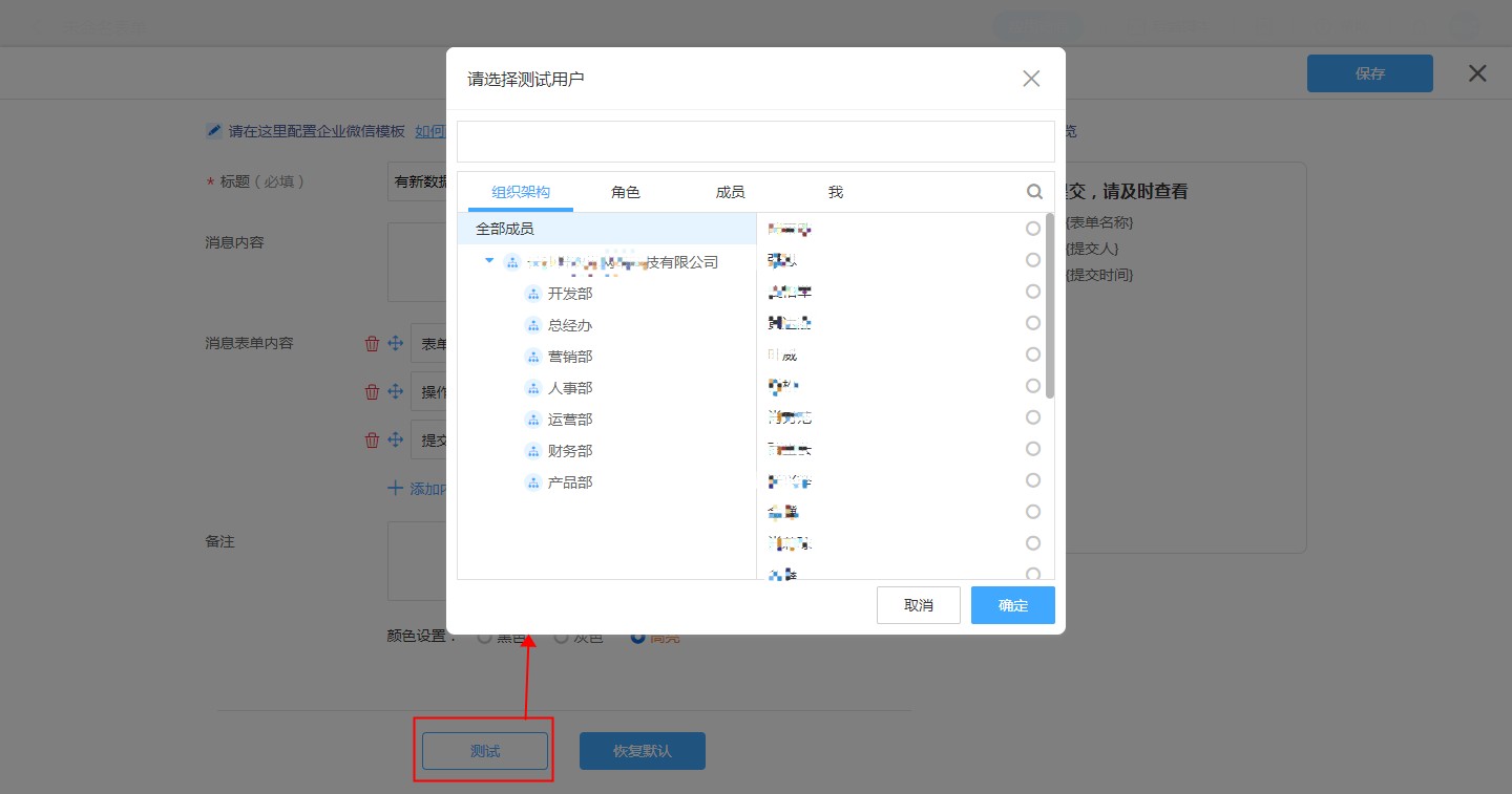 点击测试,选择收件人,确认即可将当前消息模板内容发送给此收件人。
