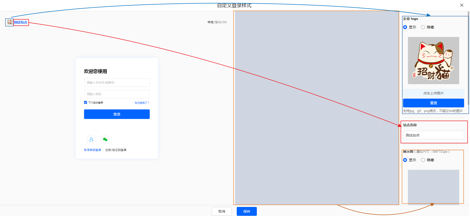 • 自定义登录页的配置,通过企业URL打开登录页生效;站点登录页的自定义样式需要私有云后台配置。