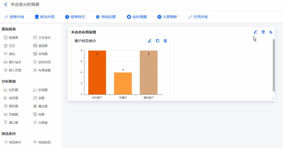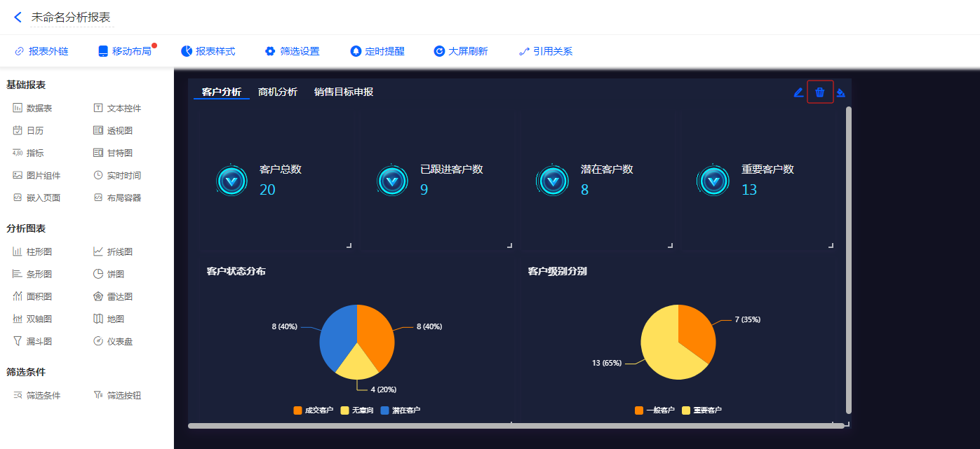 可直接拖动左侧[基础报表]、[分析图表]中的组件进布局容器内。如果有多个标签,将拖入选中的标签页中。