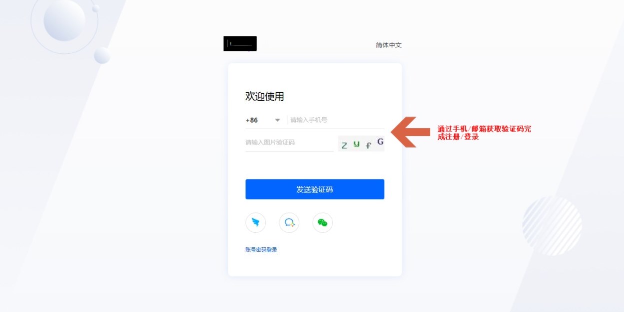 如果是新用户,通过验证码注册/登录页面可完成注册并登录平台。